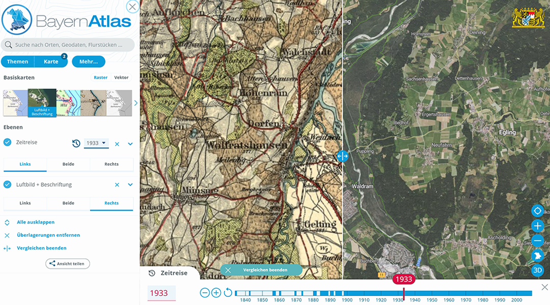 Das Werkzeug Vergleichen steht wieder zur Verfügung. Damit können verschiedene Karten – auch Basiskarten – gegenübergestellt werden. In Kombination mit der Zeitreise oder den historischen Luftbildern lassen sich so z. B. Entwicklungen einer Stadt oder Veränderungen in der Landschaft nachvollziehen.