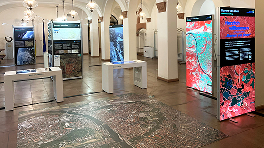 Mit der Wanderausstellung "Bayern von oben" geht das Bayerische Landesluftbildzentrum Neustadt a.d.Aisch auf Tour durch alle Regierungsbezirke und stellt seine Angebote einem breiten Publikum vor. Multimedial gestaltet und leicht verständlich aufbereitet vermittelt die Ausstellung einen spannenden Einblick in Geschichte und Technik der Luftbildfotografie. 15 Ausstellungstafeln zeigen den Besucherinnen und Besuchern, wie Luftbilder gemacht werden, wie sie aufbereitet werden und wo sie eingesetzt werden. Drei interaktive Medienstationen wie "Luftbild-Recherchestation", "Zeitreihen" und "BayernAtlas" laden zum Entdecken, Ausprobieren und Forschen ein. Weiterführende Informationen und anschauliche Animationen können über QR-Codes schnell und unkompliziert aufgerufen werden. Highlight ist ein wechselndes Bodenluftbild, das die jeweilige Region der Ausstellungsorte aus der ungewohnten Perspektive von oben zeigt und zum Entdecken einlädt.